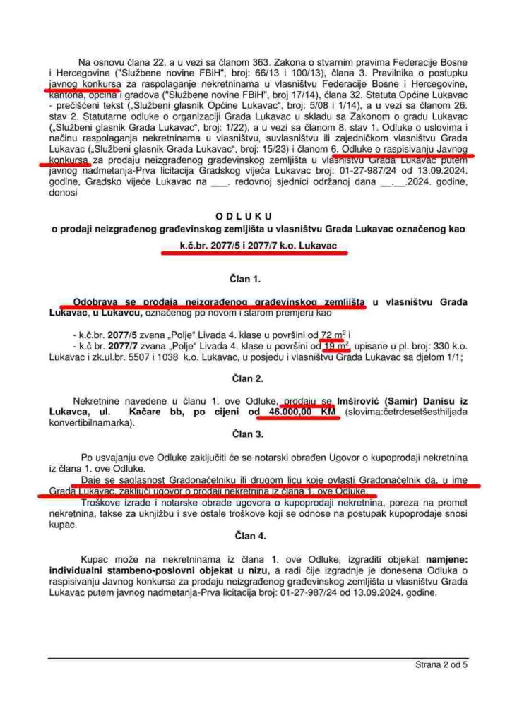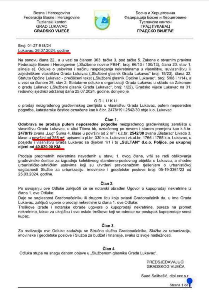 Zanimljivo je da se na dnevnom redu naredne sjednice Gradskog vijeća Lukavac također nalazi tačka o prodaji dvije parcele u Lukavcu. Radi se o k.č. 2077/5 i k.č. 2077/7 ukupne površine 91 m², koje su “prodate” za 46.000 KM, što iznosi 505,50 KM/m².