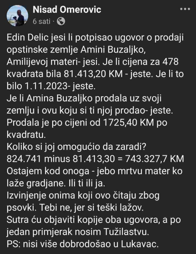 Advokat Nisad Omerović putem Facebooka je uputio ozbiljne optužbe na račun aktuelnog gradonačelnika Lukavca Edina Delića, tvrdeći da je grad prodao zemljište ispod tržišne cijene, omogućivši kupcu višemilionsku zaradu.