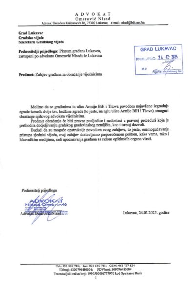 Da li advokat koji zastupa 52 građanina ima pravo da se obrati vijećnicima na sjednici Gradskog vijeća?