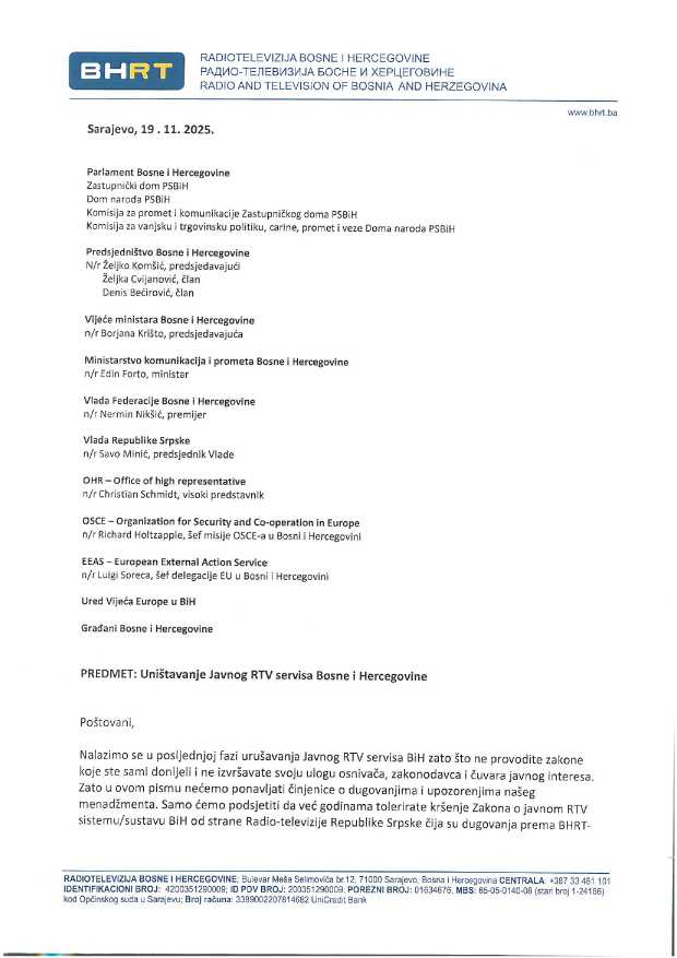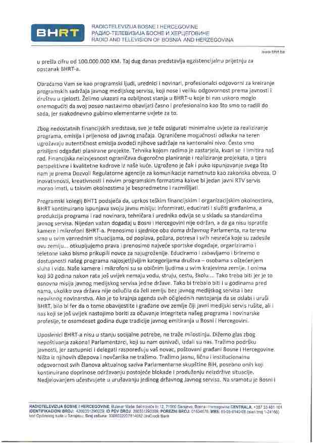 U pismu se naglašava da je stabilan javni servis preduslov za evropski put BiH, te da bi Bosna i Hercegovina mogla postati jedina zemlja u Evropi koja je ugasila svoj Javni RTV servis.