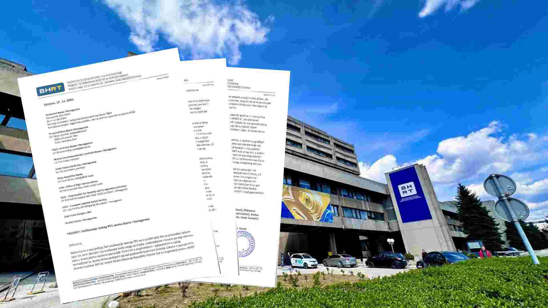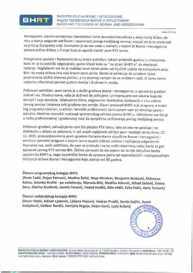 Uposlenici Radio-televizije Bosne i Hercegovine (BHRT) – urednici, novinari i tehnički profesionalci BHT1 i BH Radija 1 – uputili su javno pismo parlamentarcima, institucijama BiH, međunarodnoj zajednici i građanima, upozoravajući da se Javni RTV servis BiH nalazi u posljednjoj fazi urušavanja zbog potpune neprovedbe zakona i izostanka institucionalne odgovornosti.
