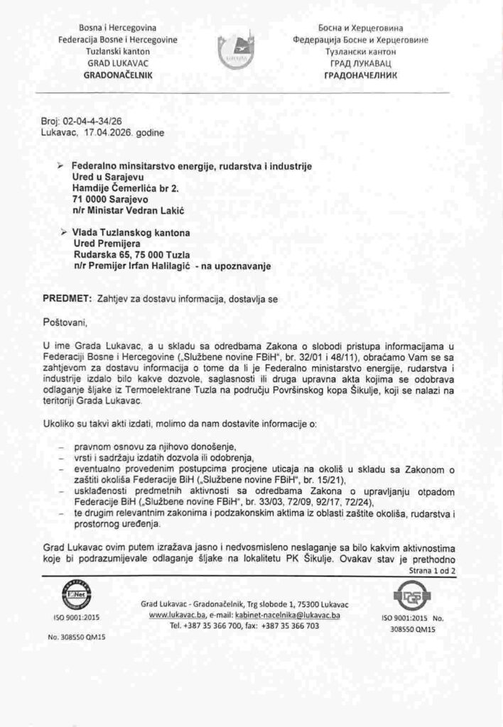 U dopisu se, pozivajući se na Zakon o slobodi pristupa informacijama FBiH, traži dostava informacija o tome da li su izdate bilo kakve dozvole ili saglasnosti koje bi omogućile odlaganje šljake iz Termoelektrane Tuzla na području PK Šikulje.
