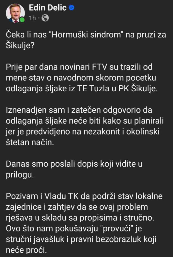 Objava je naslovljena „Čeka li nas ‘Hormuški sindrom’ na pruzi za Šikulje?“, a Delić u njoj navodi da je prije nekoliko dana, na upit novinara FTV-a, prvi put čuo za navodni skori početak odlaganja šljake na ovoj lokaciji.