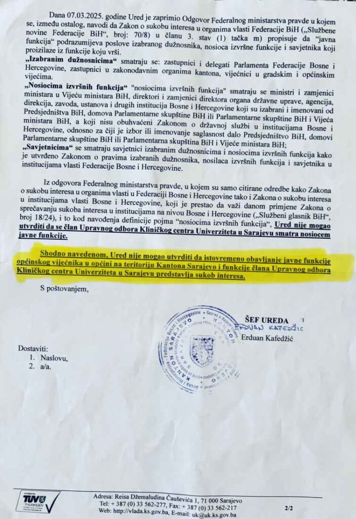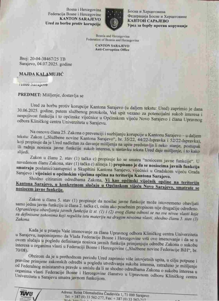 Gospođa Kalamujić nam je dostavila i Mišljenje Ureda za borbu protiv korupcije i upravljanje kvalitetom Kantona Sarajevo, u kojem se jasno navodi da nije utvrđen sukob interesa u njenom slučaju.