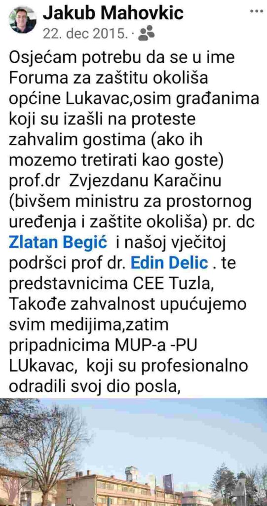 Inače, ‘Forum za zaštitu okoliše općine Lukavac” je registrovan 09.05.2015. godine, pod JIB 4210185620009 i šifrom djelatnosti “S 94.99 – Djelatnosti ostalih članskih organizacija, d. n.“, kao malo udruženje sa sjedištem na adresi ul. Redžepa ef. Munimhodžića br. 8., 75300Lukvac.