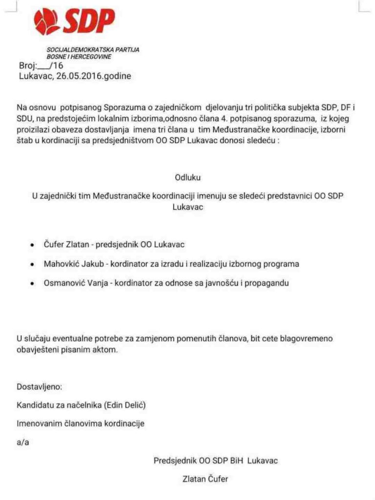 Nakon intenzivnih pregovora i lobiranja, 24. maja 2016. godine potpisan je sporazum između SDP-a, SDU-a i DF-a o zajedničkom kandidatu za načelnika, čime je formalizovana Delićeva kandidatura.