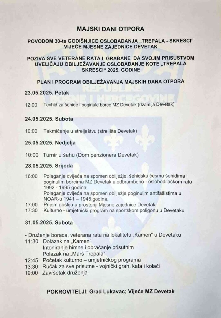 U organizaciji Vijeća Mjesne zajednice Devetak, a pod pokroviteljstvom Grada Lukavca, ove godine se obilježava 30. godišnjica oslobođenja strateške kote Trepala – Skresci. Manifestacija se održava u okviru tradicionalnih “Majskih dana otpora”, koji će trajati od 23. do 31. maja 2025. godine.