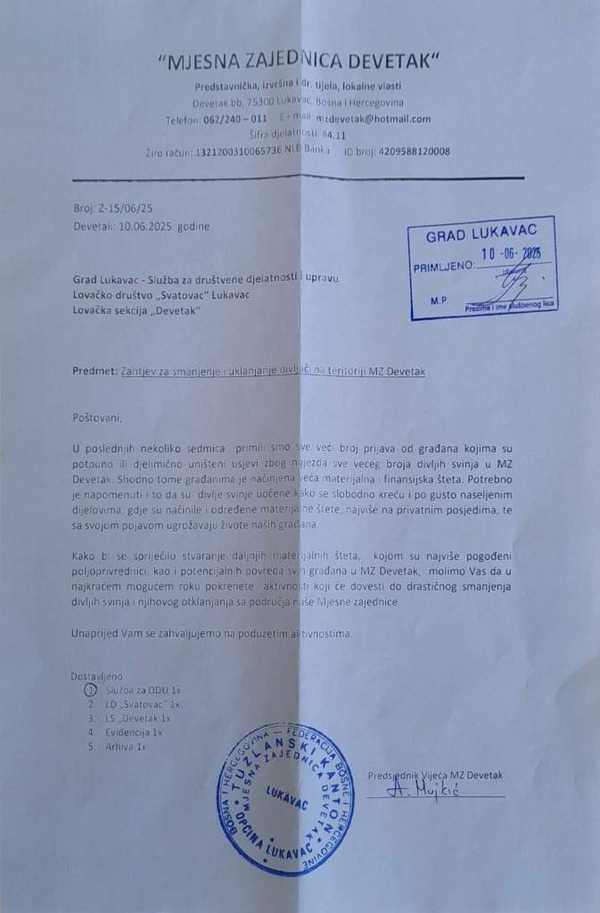 Prema navodima Vijeća, situacija u naseljima Lipovac, Mahmutovići, Prelići, Gradaškići, Gegići i Hodžići postaje alarmantna. Posljednjih dana mještani u predvečernjim satima iz straha ne napuštaju domove, jer se divlje svinje slobodno kreću po privatnim imanjima, dvorištima i okućnicama.