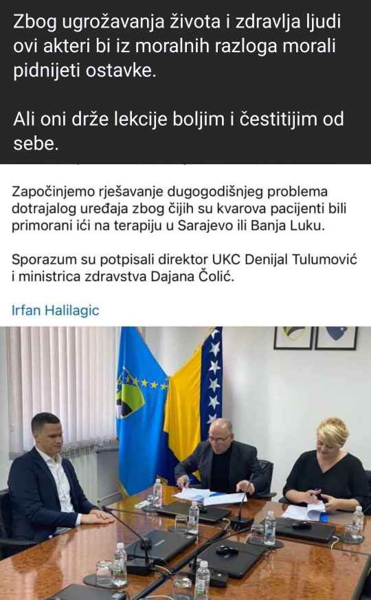 Cijenjeni Gradonačelniče, prof. dr. Deliću, kao osoba koja vodi procese u jedinici lokalne samouprave koju svi smatramo svojom, trebali biste znati i znam da znate da osnivač javne zdravstvene ustanove ima obavezu, po Zakonu o zdravstvenoj zaštiti FBiH, da obezbijedi opremu i prostor za pružanje zdravstvenih usluga. Upravo to je bio cilj potpisivanja Sporazuma, a što je zabilježeno fotografijom koju ste objavili u ovom Vašem postu.