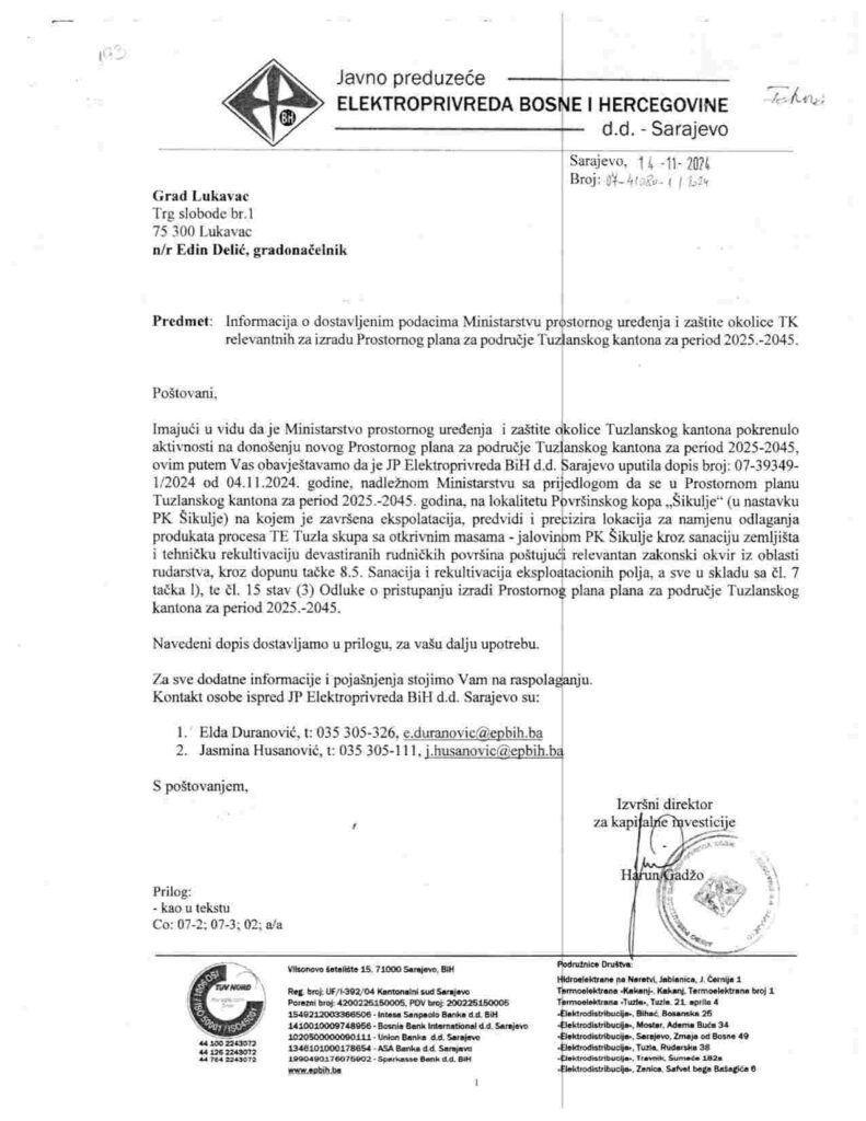 Razlog za podozrivost je u tome što Elektroprivreda BiH također traži da se Prostorni plan TK za period 2025–2045. promijeni na način da se površinski kop Šikulje pretvori u odlagalište šljake i pepela iz TE Tuzla, i s tim ciljem je uputila zahtjev Vladi TK, na čijem je čelu premijer Irfan Halilagić iz Lukavca.
