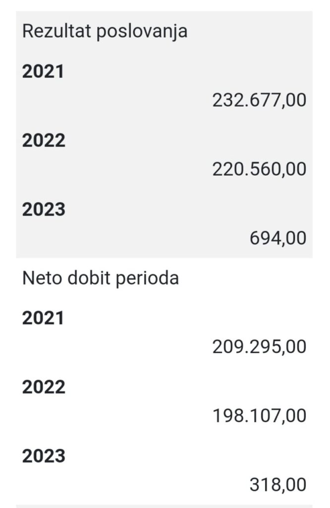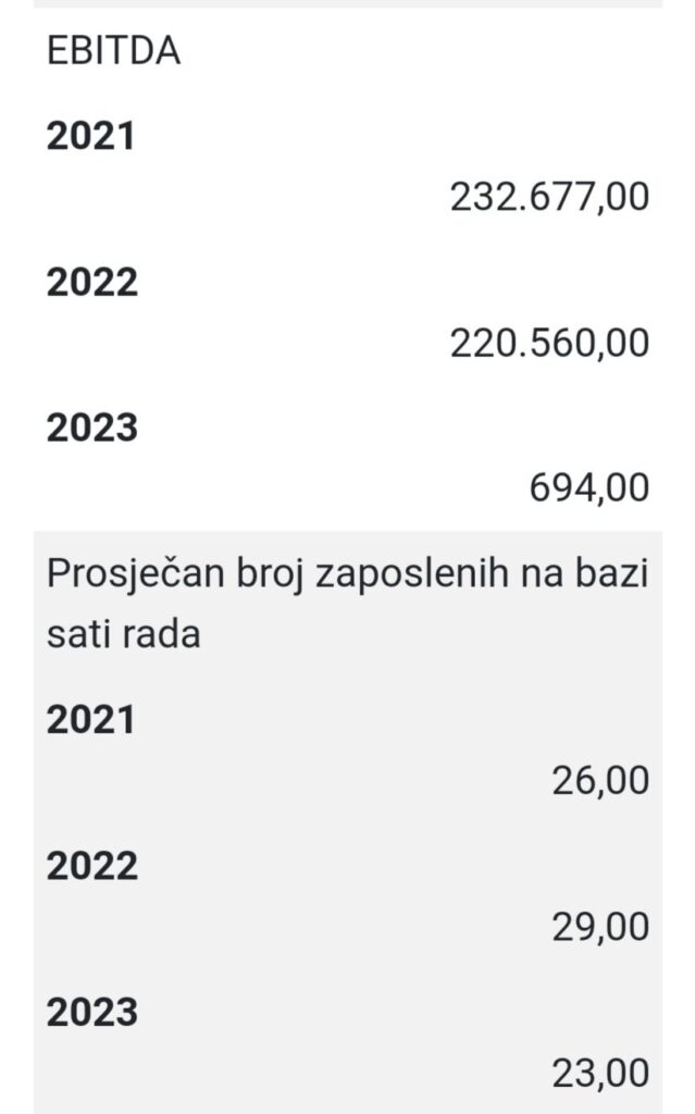 Iz podataka je očigledno da je firma zabeležila dramatičan pad prihoda i dobiti, posebno u 2023. godini, kada su prihodi pali na samo 694,00 KM, a neto dobit na 318,00 KM. Ovaj pad pokazuje ozbiljan finansijski kolaps, koji se ne može objasniti samo povećanjem minimalne plate. Pad broja zaposlenih, koji je sa 29 radnika u 2022. godini pao na 23 u 2023. godini, ukazuje na smanjenje obima poslovanja i smanjenje kapaciteta firme.
