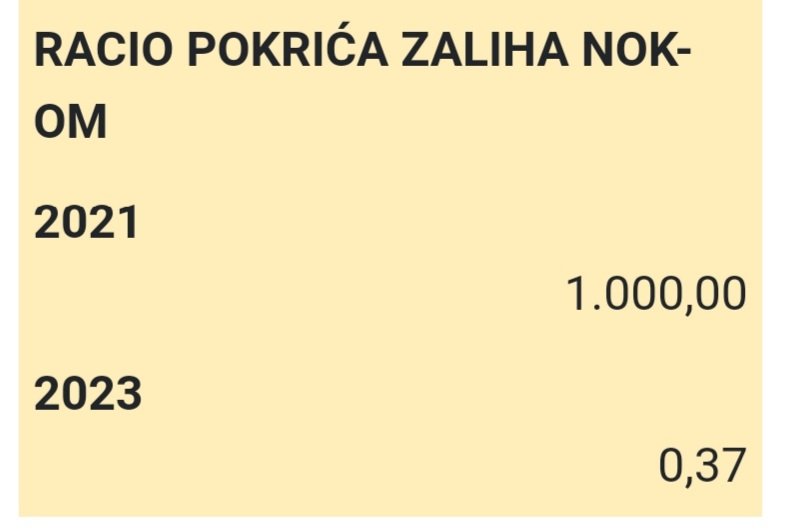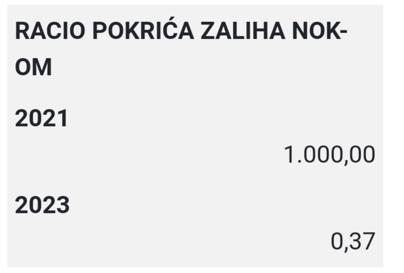 Jedan od ključnih finansijskih pokazatelja je racio pokrića zaliha neto obrtnim kapitalom (NOK), koji je u 2021. godini iznosio 1.000,00. Ovo znači da je neto obrtni kapital hiljadu puta premašivao vrednost zaliha firme. Iako na prvi pogled ovaj racio deluje pozitivno, on može ukazivati na neefikasno korišćenje kapitala, jer firma možda nije imala potrebu da ulaže u proizvodne kapacitete, a umesto toga držala je previše gotovine ili potraživanja. Ovaj pokazatelj ukazuje na mogući problem sa strateškim planiranjem i nedostatak ulaganja u razvoj poslovanja.