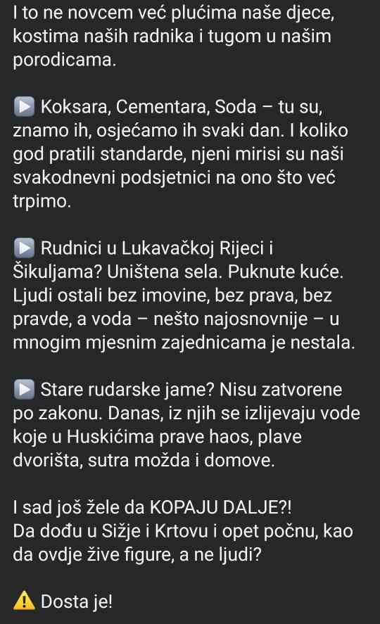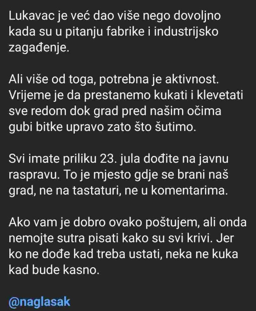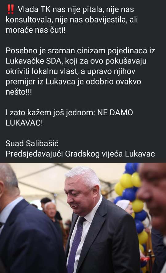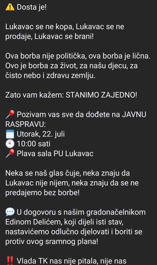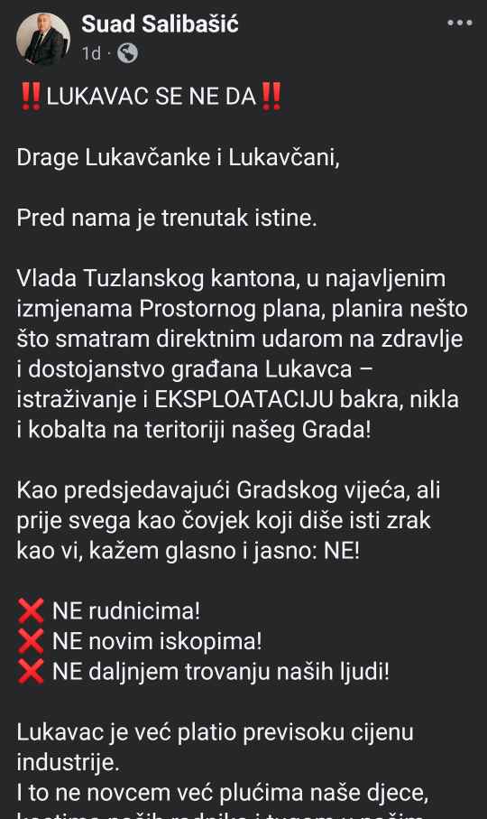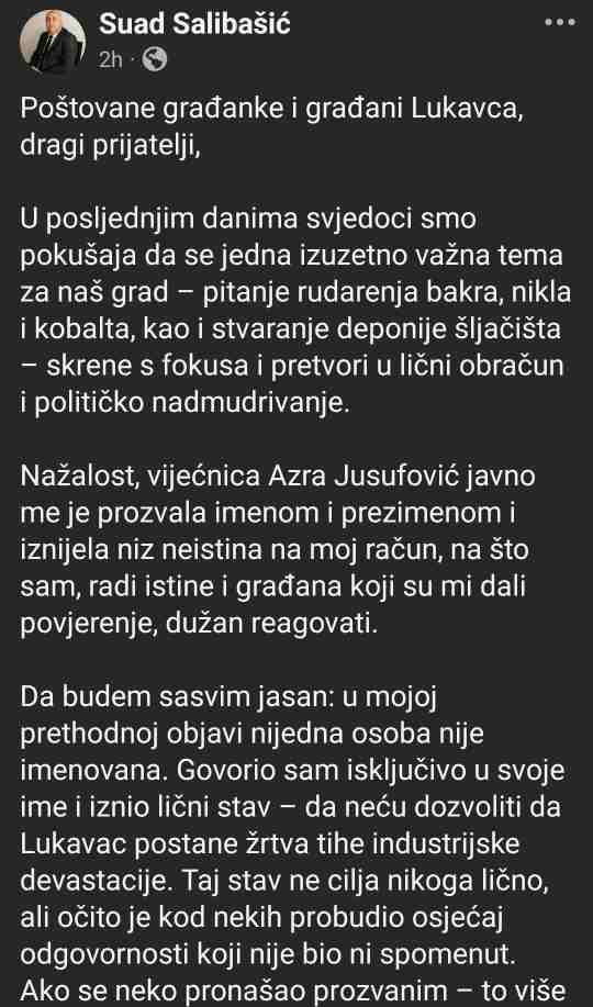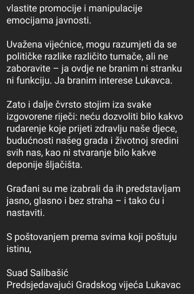 Predsjedavajući Salibašić je dan kasnije objavio emotivnu i oštru poruku u kojoj ističe da je planirana rudarska aktivnost “direktan udar na zdravlje i dostojanstvo građana Lukavca”. Njegov status sadržavao je jasne poruke: “NE rudnicima! NE novim iskopima! NE daljnjem trovanju naših ljudi!”, pozivajući sve građane da dođu na javnu raspravu i daju otpor ovom, kako kaže, “sramnom planu”. Iako nije imenovao pojedince, kritiku je uputio prema SDA, optužujući kadrove iz te stranke da odgovornost pokušavaju prebaciti na lokalnu vlast, i podsjetio da je premijer TK upravo iz Lukavca i član SDA.