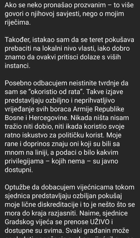 Salibašić nije ostao dužan. U svom najnovijem statusu, poručio je da nikoga nije imenovao i da je njegova borba isključivo borba za interese građana. Odgovor vijećnice Jusufović nazvao je “nizom neistina” i pokušajem diskreditacije. Naglasio je da njegove ratne rane nisu korištene za političku promociju, te odbacio tvrdnje o neprikladnom ponašanju tokom sjednica Gradskog vijeća. Podsjetio je i da su on i vijećnica komšije, što, kako je naveo, čini njen javni napad dodatno razočaravajućim.
