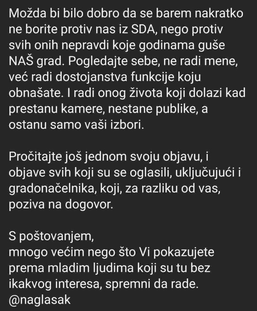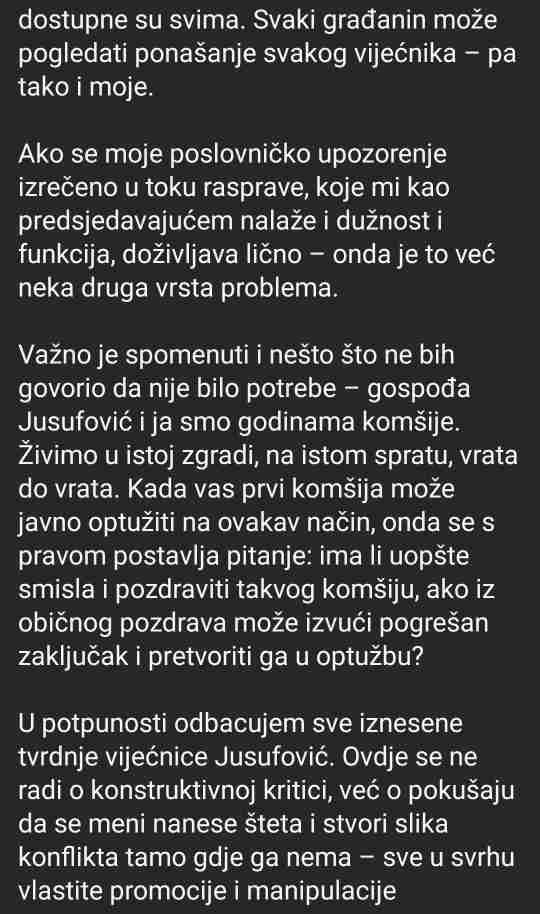 Ubrzo je uslijedio odgovor vijećnice Jusufović, koji je dodatno produbio tenzije. Ona je izrazila iznenađenje što ju je Salibašić “prozvao” i optužila ga za glumu i dvostruki nastup – jedan pred kamerama, a drugi u privatnim razgovorima. U svom obraćanju navela je da ne vodi politiku napada i da ne želi da se građanska borba za zdrav okoliš pretvori u lične i političke sukobe. Istakla je i da se poziva na jedinstvo, a ne podjele.