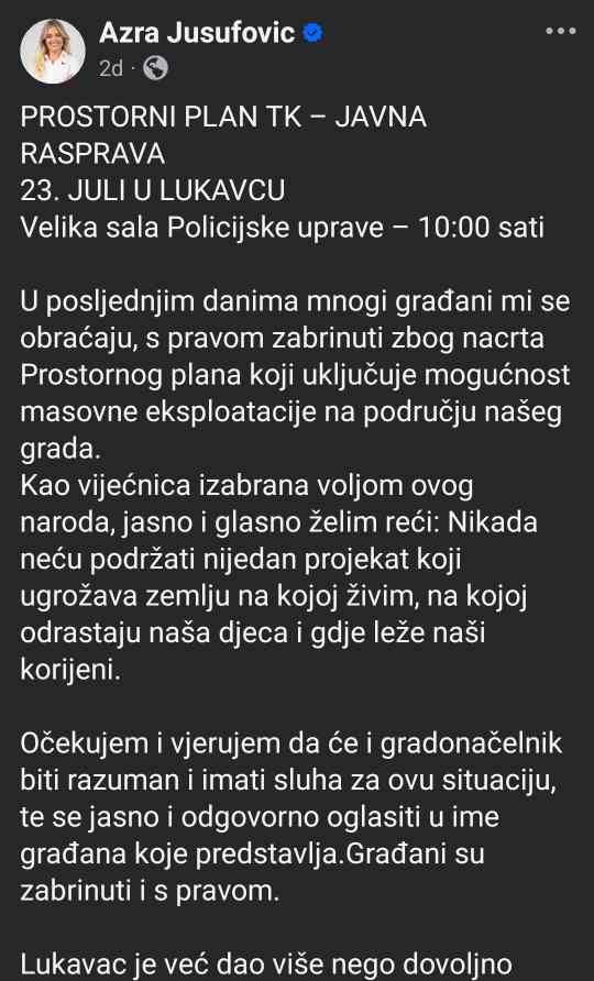 Vijećnica Jusufović prva se oglasila na svom Facebook profilu 18. jula, upozorivši javnost na opasnosti koje donosi nacrt Prostornog plana, pozivajući građane da se aktivno uključe i prisustvuju javnoj raspravi zakazanoj za 23. juli u velikoj sali Policijske uprave u Lukavcu. Istakla je da “nikada neće podržati nijedan projekat koji ugrožava zemlju na kojoj živimo”, pozivajući i gradonačelnika da zauzme jasan stav.