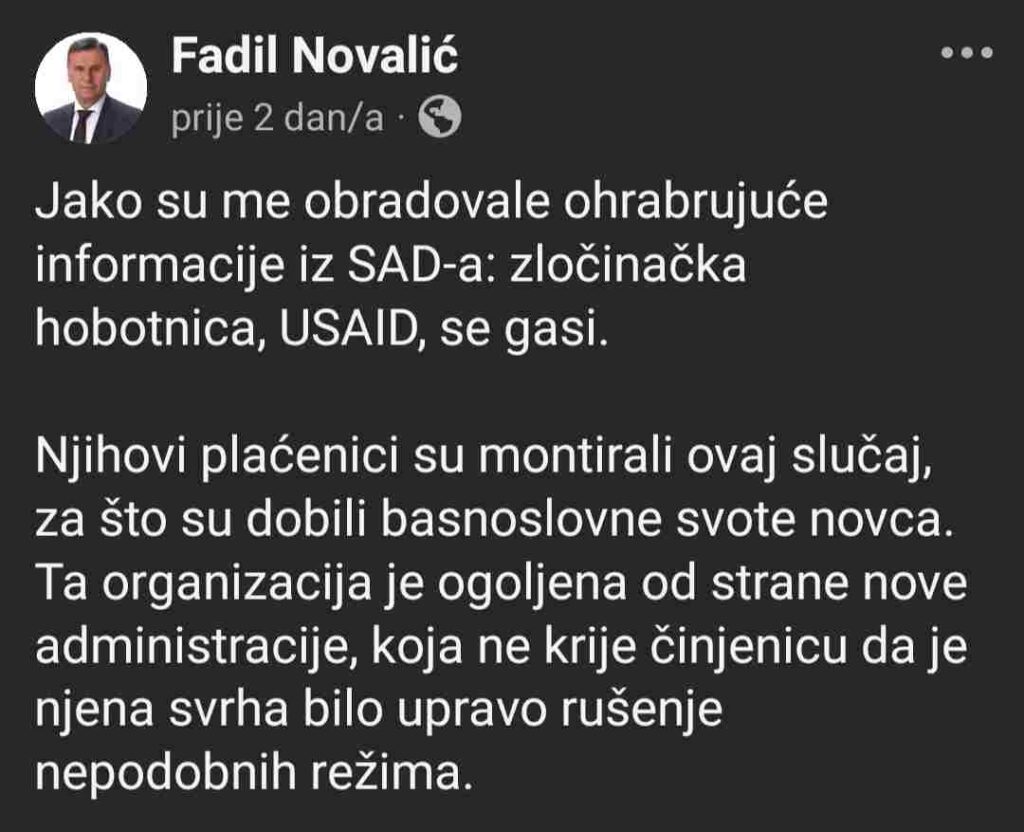 Bivši premijer Federacije BiH, Fadil Novalić, nedavno je na svom Facebook profilu izrazio „radost“ zbog navodnog gašenja USAID-a, nazivajući ovu organizaciju „zločinačkom hobotnicom“ i optužujući je za političke manipulacije.