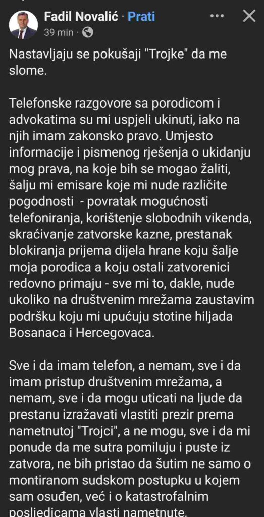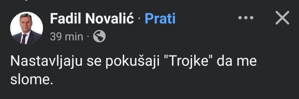 Jutros sa na Facebook stranici pod nazivom “Fadil Novalić”, pojavio novi post, a u njemu “Fadil” tvrdi da se suočava s pokušajima vlasti, koju naziva “Trojkom”, da ga slomi.