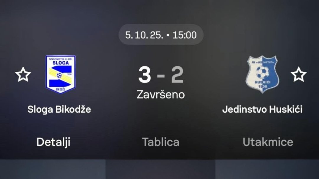 U okviru 6. kola Druge kantonalne lige TK Istok, fudbaleri FK Jedinstvo Huskići gostovali su u Bikodžama gdje su poraženi rezultatom 3:2.