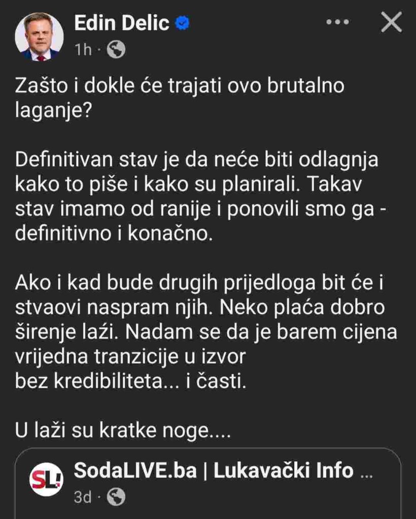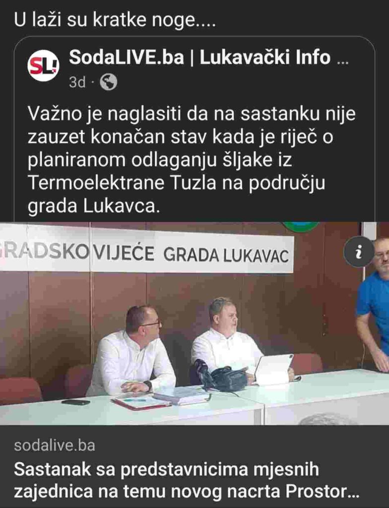 Gradonačelnik Lukavca Edin Delić javno je na svojpj FB strsnici optužio portal SodaLive.ba za, kako kaže, “brutalno laganje” u vezi s planovima za odlaganje otpada, poručivši da se takve neistine šire namjerno i uz nečiju finansijsku podršku.