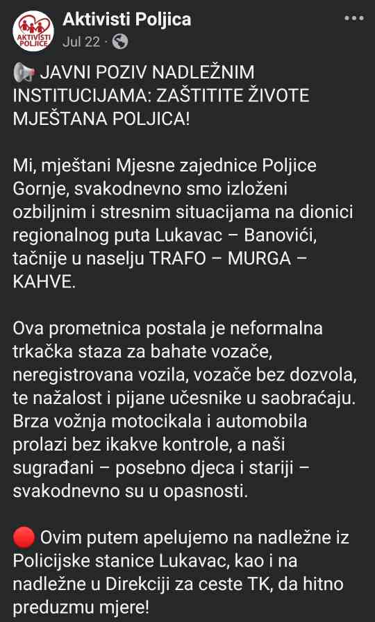 Aktivisti iz Poljica nastavljaju borbu za sigurnost na dionici puta Graljevac – Kahve, gdje je, prema njihovim riječima, česta pojava divljanja vozila koja ugrožava živote mještana i ostalih učesnika u saobraćaju.