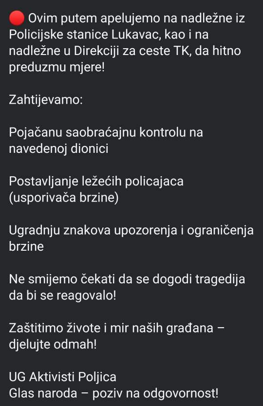 Aktivisti ističu da očekuju kako će Direkcija cesta TK i druge odgovorne institucije prepoznati ozbiljnost problema i poduzeti konkretne mjere kako bi ova dionica postala sigurnija.