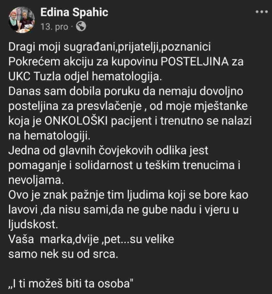Edina Spahić iz Orahovice sredinom decembra pokrenula je humanitarnu akciju pod nazivom “I ti možeš biti ta odoba”, kako bi pomogla pacijentima na odjelu hematologije UKC-a Tuzla. Na ovom odjelu, gdje se liječe pacijenti u izuzetno teškom zdravstvenom stanju, boravak nije samo fizički izazov, već i borba s osnovnim uvjetima. Nedostatak posteljine za presvlačenje postao je ozbiljan problem, a Edina je odlučila poduzeti korak ka rješenju.