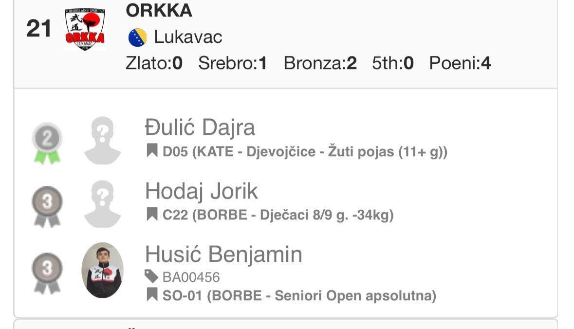 Karatisti Kluba borilačkih sportova ORKKA Lukavac ostvarili su izvanredan uspjeh osvojivši ukupno 13 medalja – pet zlatnih, četiri srebrne i četiri bronzane. Takmičari su nastupali pod vodstvom trenera Dore Fazlić, Emira Ćosićkića i Benjamina Husića.