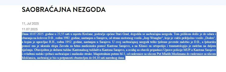 “Tačno je da se kritičnog dana i vremena na pomenutom lokalitetu dogodila saobraćajna nezgoda, ali nije tačno da je u istoj teške tjelesne povrede zadobio obični pješak. Teške tjelesne povrede u vidu višestrukih lomova na tijelu zadobio je policijski službenik prilikom obavljanja redovnih poslova i zadataka.”