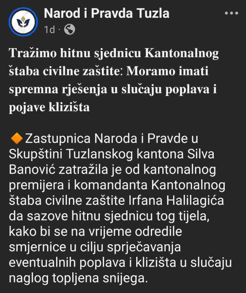 Nakon zastupnice NiP-a u Skupštini TK, Silve Banović, NiP-ov vijećnik GV Tuzla upozorava na blagovremene pripreme za potencijalne poplave