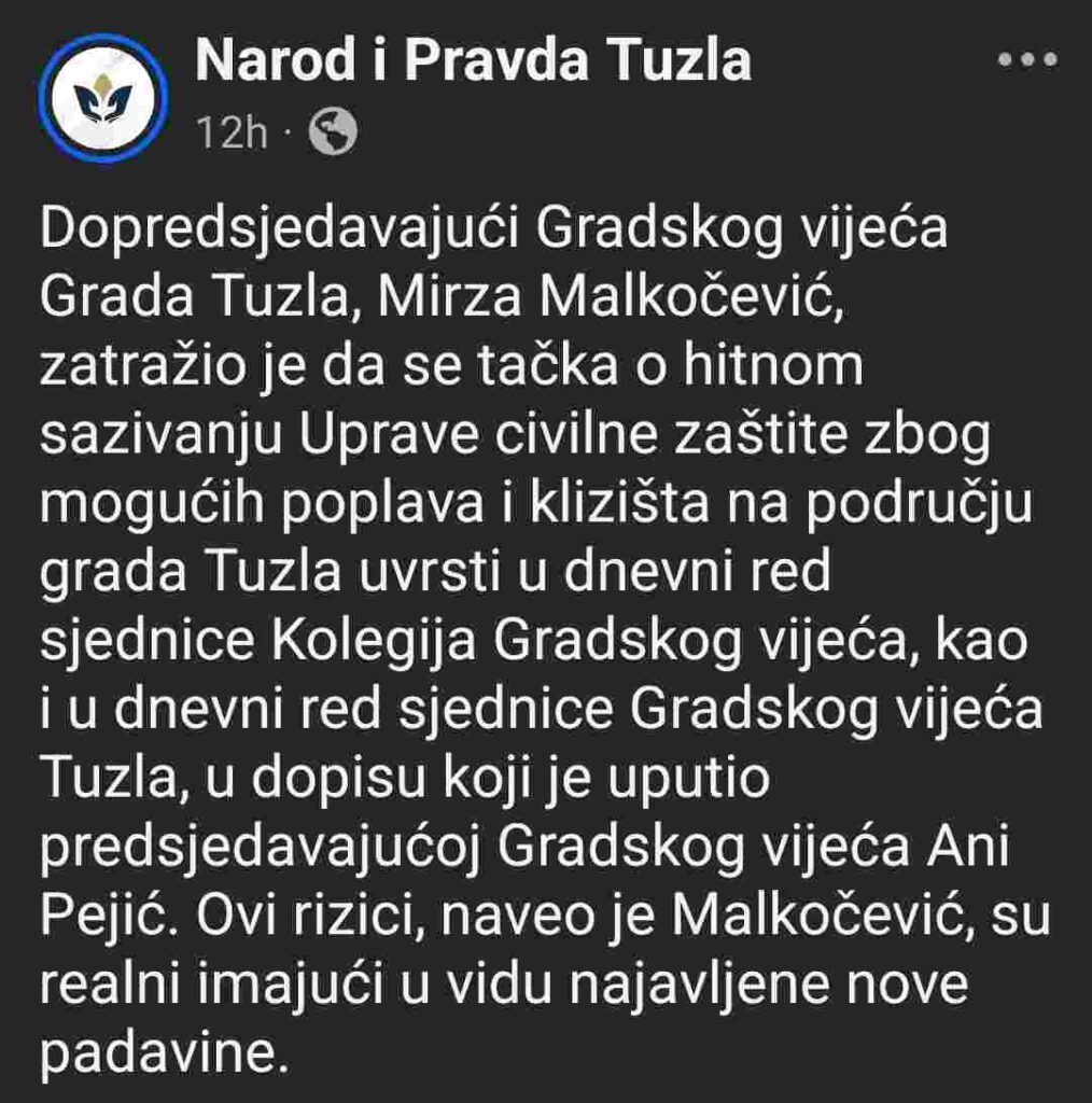 Vijećnik i dopredsjedavajući Gradskog vijeća Grada Tuzla, Mirza Malkočević, zatražio je da se tačka o hitnom sazivanju Uprave civilne zaštite zbog mogućih poplava i klizišta na području Tuzle uvrsti u dnevni red sjednice Kolegija Gradskog vijeća, kao i u dnevni red sjednice Gradskog vijeća Tuzla. Ovu inicijativu Malkočević je uputio predsjedavajućoj Gradskog vijeća, Ani Pejić, ističući da su rizici realni s obzirom na najavljene nove padavine.