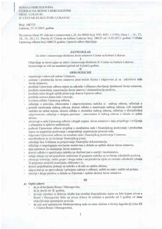 Raspisivanje javnih oglasa za rukovodeće pozicije u javnim ustanovama trebalo bi biti jedan od ključnih mehanizama transparentnosti, jednakih šansi i depolitizacije upravljanja javnim resursima. Međutim, konkurs za izbor direktora Javne ustanove Centar za kulturu Lukavac, u obliku u kojem je pripremljen, otvorio je niz ozbiljnih pitanja – od zakonitosti i formalne ispravnosti, do moguće diskriminacije i prilagođavanja unaprijed poznatom kandidatu..