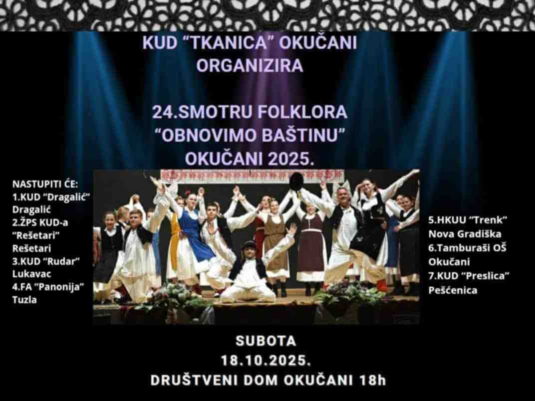 Članovi Kulturno-umjetničkog društva „Rudar“ Lukavac boravili su u subotu, 18. oktobra 2025. godine, u Okučanima, gdje su učestvovali na 24. smotri folklora „Obnovimo baštinu“. Ovaj susret bio je prilika da se ponovo susretnu sa starim prijateljima i nastave dugogodišnje kulturno drugarstvo koje traje uprkos brojnim izazovima i preprekama.