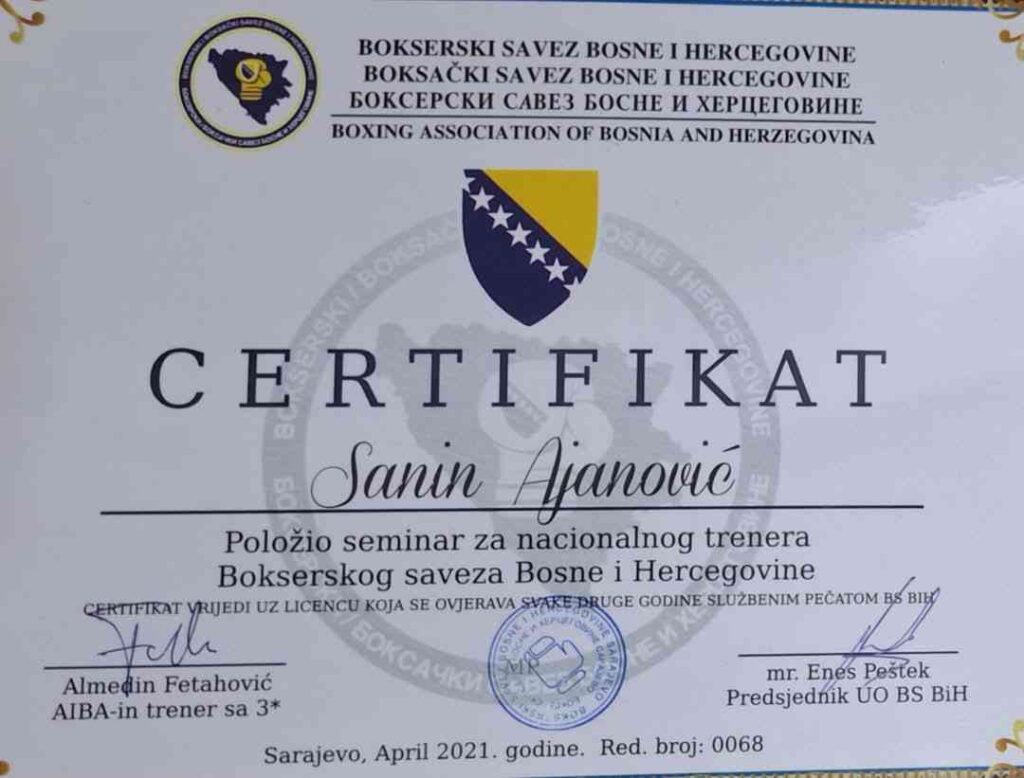 Sanin Ajanović, licencirani nacionalni trener u olimpijskom boksu od 2021. godine, član je trenerskog tima juniorske reprezentacije Bosne i Hercegovine.