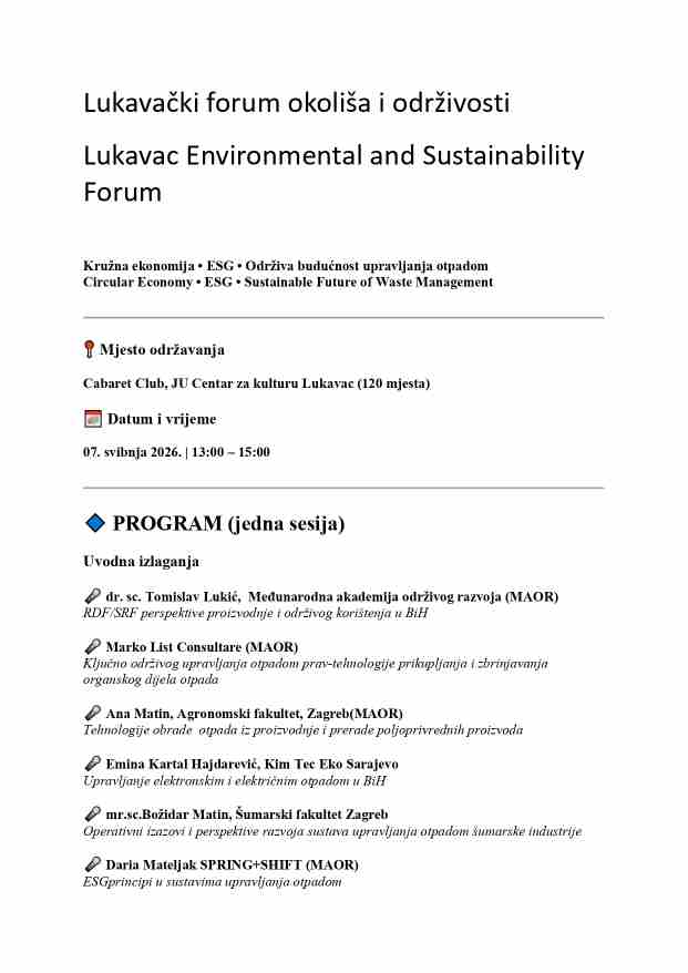 Lukavački Sajam turizma i ekologije LIST počinje 7. maja 2026. godine u Lukavcu i traje dva dana, a u okviru njegovih pratećih aktivnosti bit će održan i „Lukavački forum okoliša i održivosti“. Forum će okupiti domaće i regionalne stručnjake iz oblasti ekologije, upravljanja otpadom i održivog razvoja, s fokusom na kružnu ekonomiju i ESG principe.