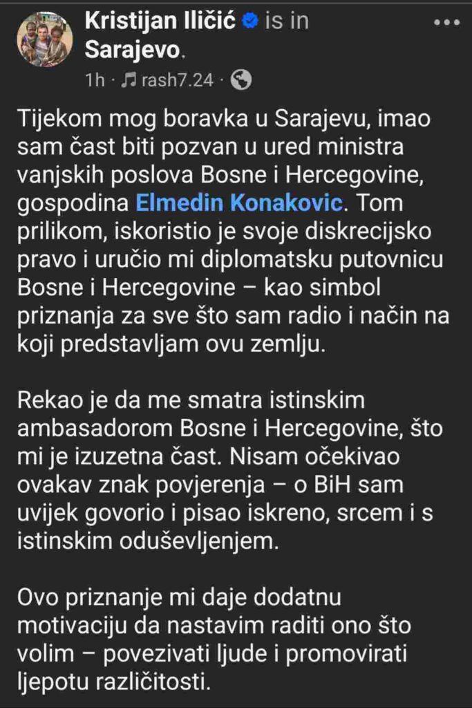 Kristijan Iličić, poznati putopisac i influenser iz Hrvatske, doživio je poseban trenutak tokom boravka u Sarajevu kada mu je ministar vanjskih poslova Bosne i Hercegovine, Elmedin Konaković, uručio diplomatski pasoš BiH. Ovaj čin, kako je istaknuto, predstavlja znak zahvalnosti i priznanja za sve što je Iličić uradio na promociji BiH širom svijeta.
