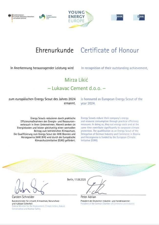 Mladi inženjeri Lukavac Cementa, Monika Durmić i Ademir Ćosićkić, učestvovali su u završnici prestižnog evropskog programa Young Energy Europe, koja je održana u Berlinu. Pred stručnjacima iz različitih zemalja Evrope, predstavili su projekat svog tima pod nazivom “Optimizacija sistema grijanja upotrebom otpadne toplote iz procesa u fabrici”.