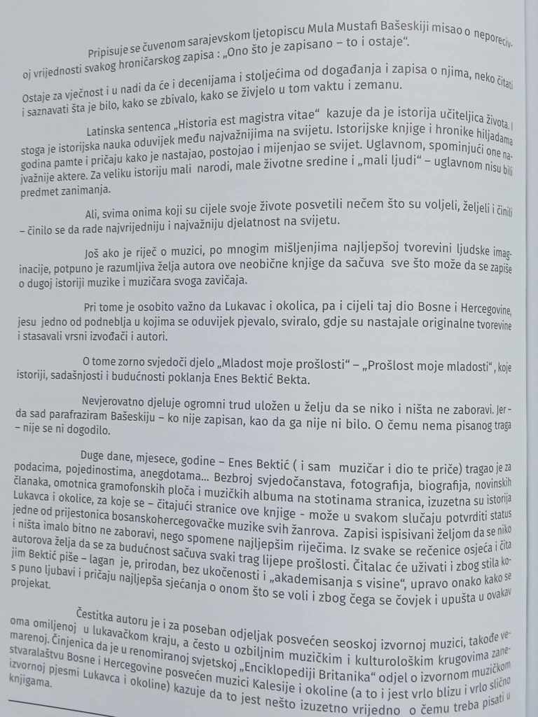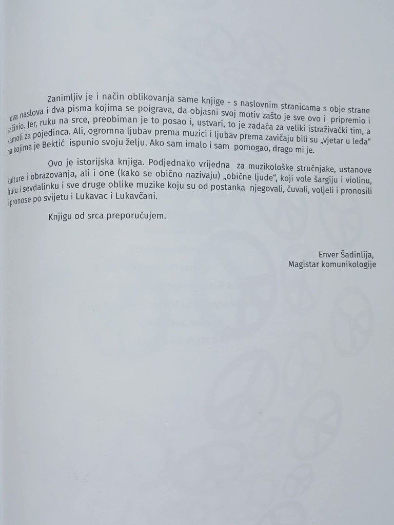 “Ovo je istorijska knjiga. Podjednako vrijedna za muzikološke stručnjake, ustanove kulture i obrazovanja, ali i za one koje nazivamo ‘običnim ljudima’, koji vole šargiju, violinu, frulu, sevdalinku i sve oblike muzike koje su Lukavčani oduvijek njegovali i nosili sa sobom kroz život i svijet.”