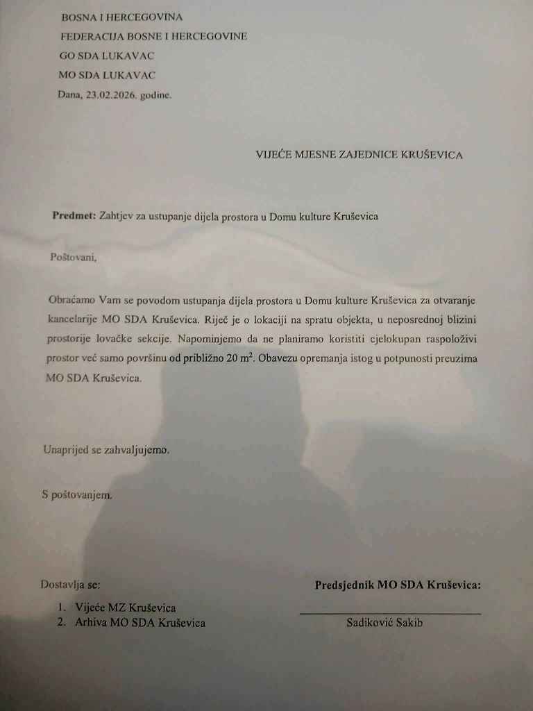 MO SDA Kruševica saopštila je da je 23. februara 2026. godine uputila zahtjev Vijeću Mjesne zajednice Kruševica za ustupanje dijela Doma kulture, u svrhu otvaranja kancelarije za rad ove stranačke organizacije.