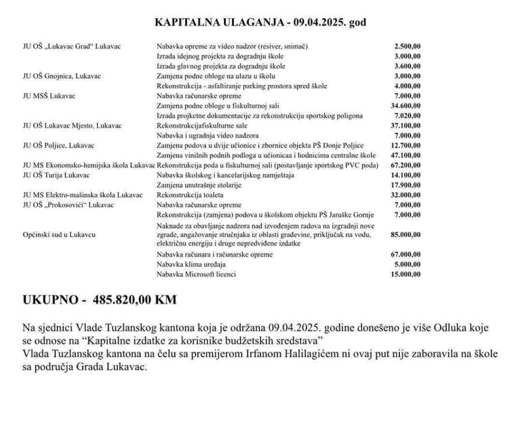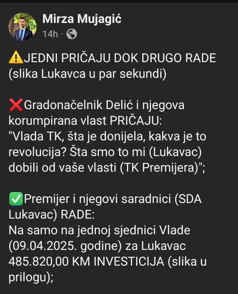 Na nedavno održanoj sjednici Vlade Tuzlanskog kantona, 9. aprila 2025. godine, za područje Lukavca odobrena su sredstva u iznosu od 485.820,00 KM, što je vijećnik i predsjednik klub vijećnika SDA u gradskom vijeću Lukavac, Mirza Mujagić, iskoristio kako bi demantovao tvrdnje aktuelnog gradonačelnika Edina Delića.
