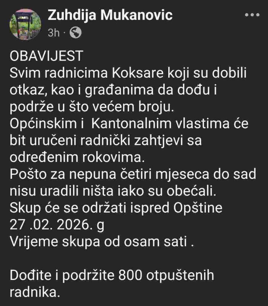 Na društvenoj mreži Facebook proteklih sati dijeli se objava kojom se pozivaju radnici i građani da prisustvuju skupu podrške otpuštenim radnicima lukavačke koksare.