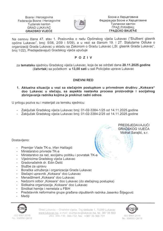 Danas, s početkom u 13:00 sati, u Plavoj sali Policijske uprave Lukavac biće održana Tematska sjednica Gradskog vijeća Lukavac, posvećena samo jednoj, ali izuzetno važnoj tački dnevnog reda – aktuelnoj situaciji u vezi sa stečajnim postupkom u privrednom društvu “Koksara” d.o.o. Lukavac u stečaju, posebno u kontekstu nastavka proizvodnje i socijalnog zbrinjavanja radnika kojima je radni odnos prekinut.