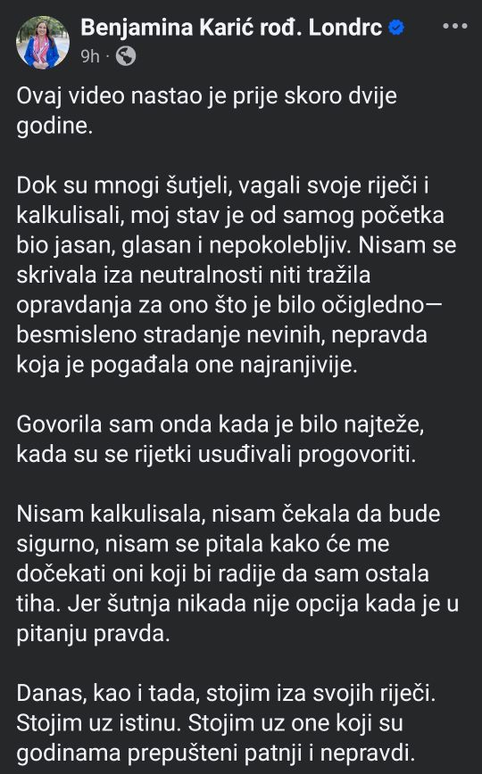 “Ovaj video nastao je prije skoro dvije godine. Dok su mnogi šutjeli, vagali svoje riječi i kalkulisali, moj stav je od samog početka bio jasan, glasan i nepokolebljiv. Nisam se skrivala iza neutralnosti niti tražila opravdanja za ono što je bilo očigledno—besmisleno stradanje nevinih, nepravda koja je pogađala one najranjivije. Govorila sam onda kada je bilo najteže, kada su se rijetki usuđivali progovoriti. Nisam kalkulisala, nisam čekala da bude sigurno, nisam se pitala kako će me dočekati oni koji bi radije da sam ostala tiha. Jer šutnja nikada nije opcija kada je u pitanju pravda. Danas, kao i tada, stojim iza svojih riječi. Stojim uz istinu. Stojim uz one koji su godinama prepušteni patnji i nepravdi.”