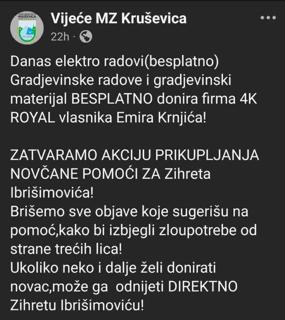 “Zatvaramo akciju prikupljanja novčane pomoći za Zihreta Ibrišimovića! Brišemo sve objave koje sugerišu na pomoć, kako bismo izbjegli zloupotrebe od strane trećih lica.”