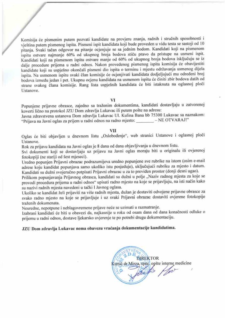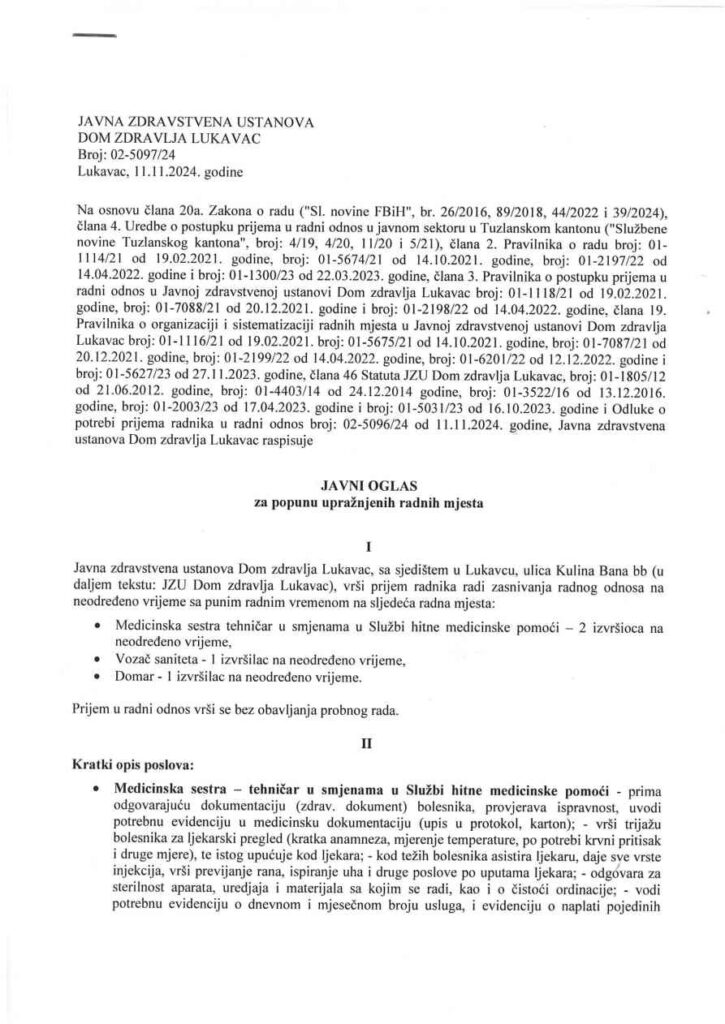 JU Dom zdravlja Lukavac raspisao je “JAVNI OGLAS za popunu upražnjenih radnih mjesta” – 4 radnika “radi zasnivanja radnog odnosa na neodređeno vrijeme sa punim radnim vremenom”
