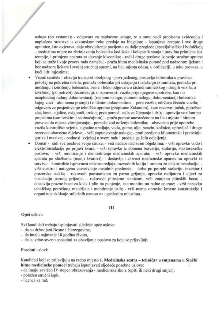 Kandidati koji se prijavljuju na radno mjesto 1. Medicinska sestra — tehničar u smjenama u Službi hitne medicinske pomoći trebaju ispunjavati sljedeće posebne uslove: