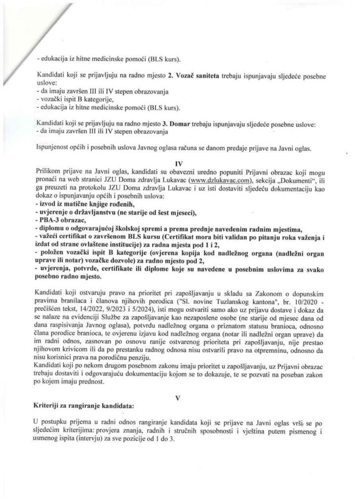 Kandidati koji se prijavljuju na radno mjesto 2. Vozač saniteta trebaju ispunjavaju sljedeće posebne uslove: