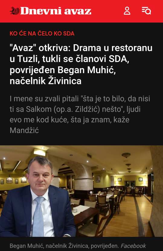 Prema pisanju Dnevng Avaza od 23. januara 2024. godine, u članku pod nazivom “”Avaz” otkriva: Drama u restoranu u Tuzli, tukli se članovi SDA, povrijeđen Began Muhić, načelnik Živinica” u jednom tuzlanskom restoranu noć prije je došlo do fizičkog obračuna članova Stranke demokratske akcije (SDA).