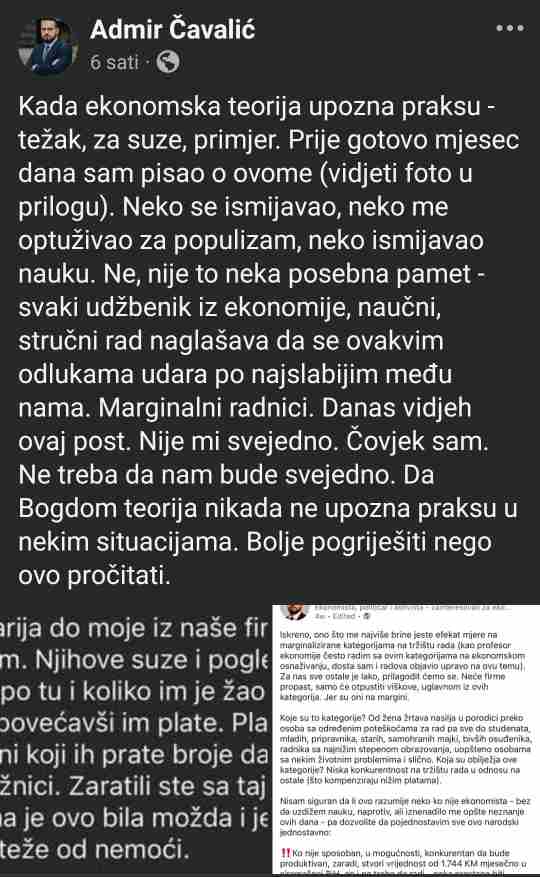 Danas je g. Admir Cavalić, zastupnik u Predstavničkom domu Parlamenta FBiH, doktor ekonomskih nauka i predavač, na svojoj fb stranici podijelio objavu o otpuštanju sedam radnika iz firme Intrag d.o.o. Tuzla, naglašavajući da su svi oni osobe s invaliditetom. Ovakav razvoj događaja je nesumnjivo tragičan, ali je pažnju privukla brzina kojom je Čavalić odgovornost pripisao Vladi Federacije BiH i povećanju minimalne plate na 1.000 KM.