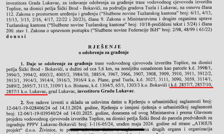 S tim u vezi, objavio je fotografiju dijela dokumenta naslovljenog „RJEŠENJE o odobrenju za građenje“, koje se konkretno odnosi na izgradnju cjevovoda kojim će voda iz Toplica od Šićkog ići prema – Bokavićima.